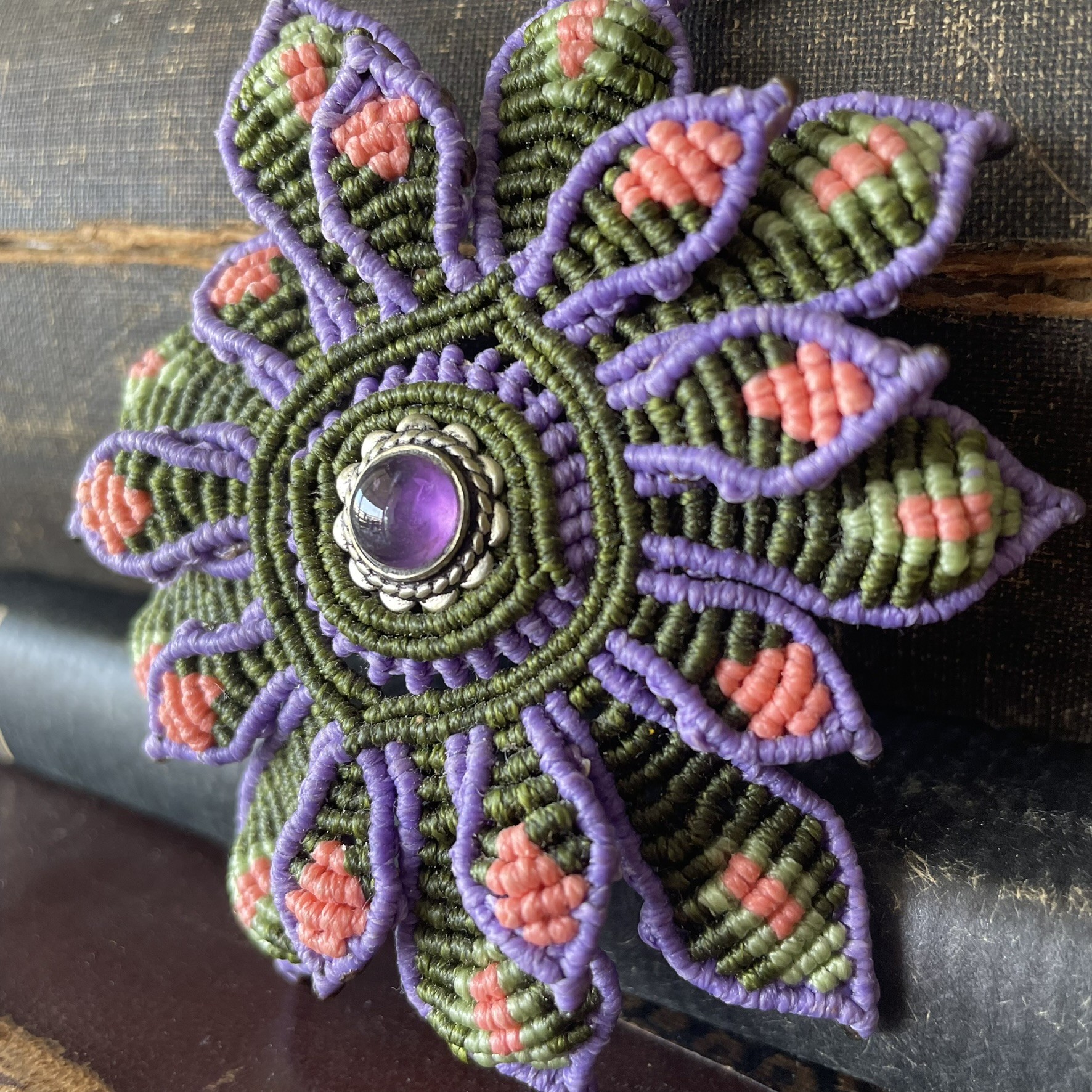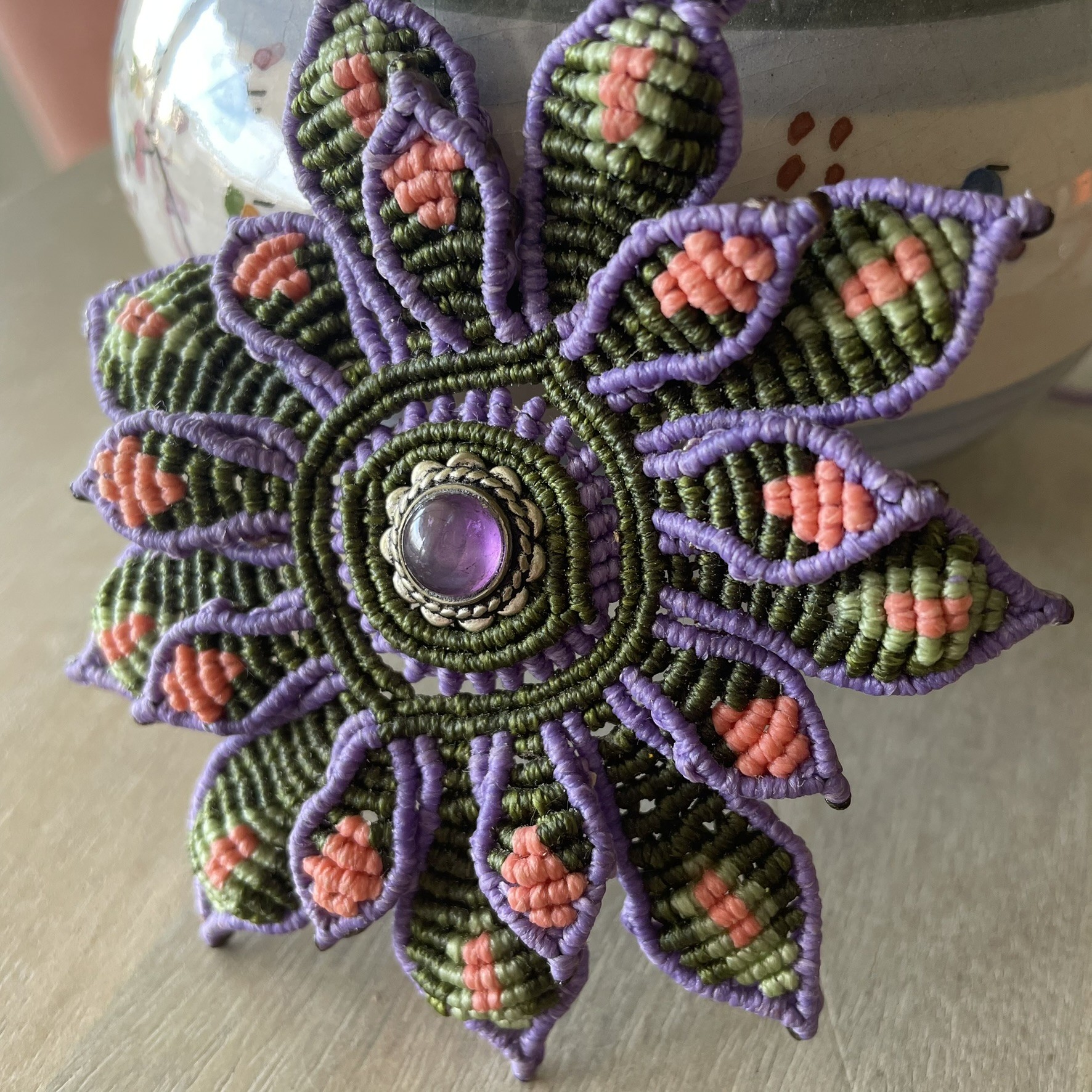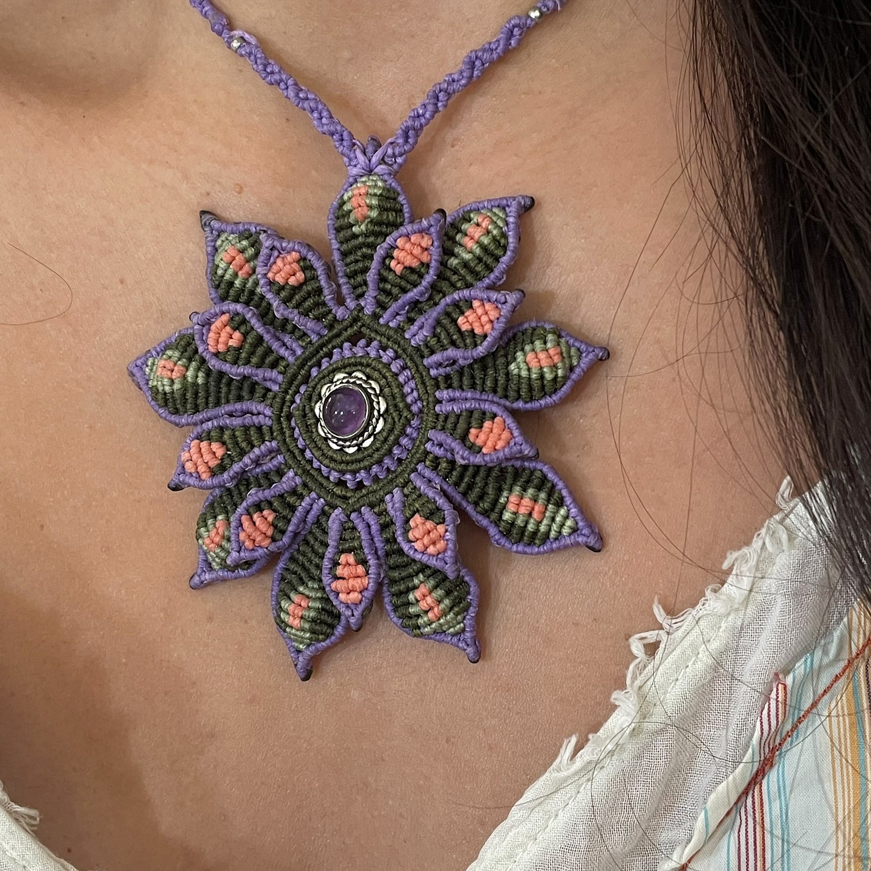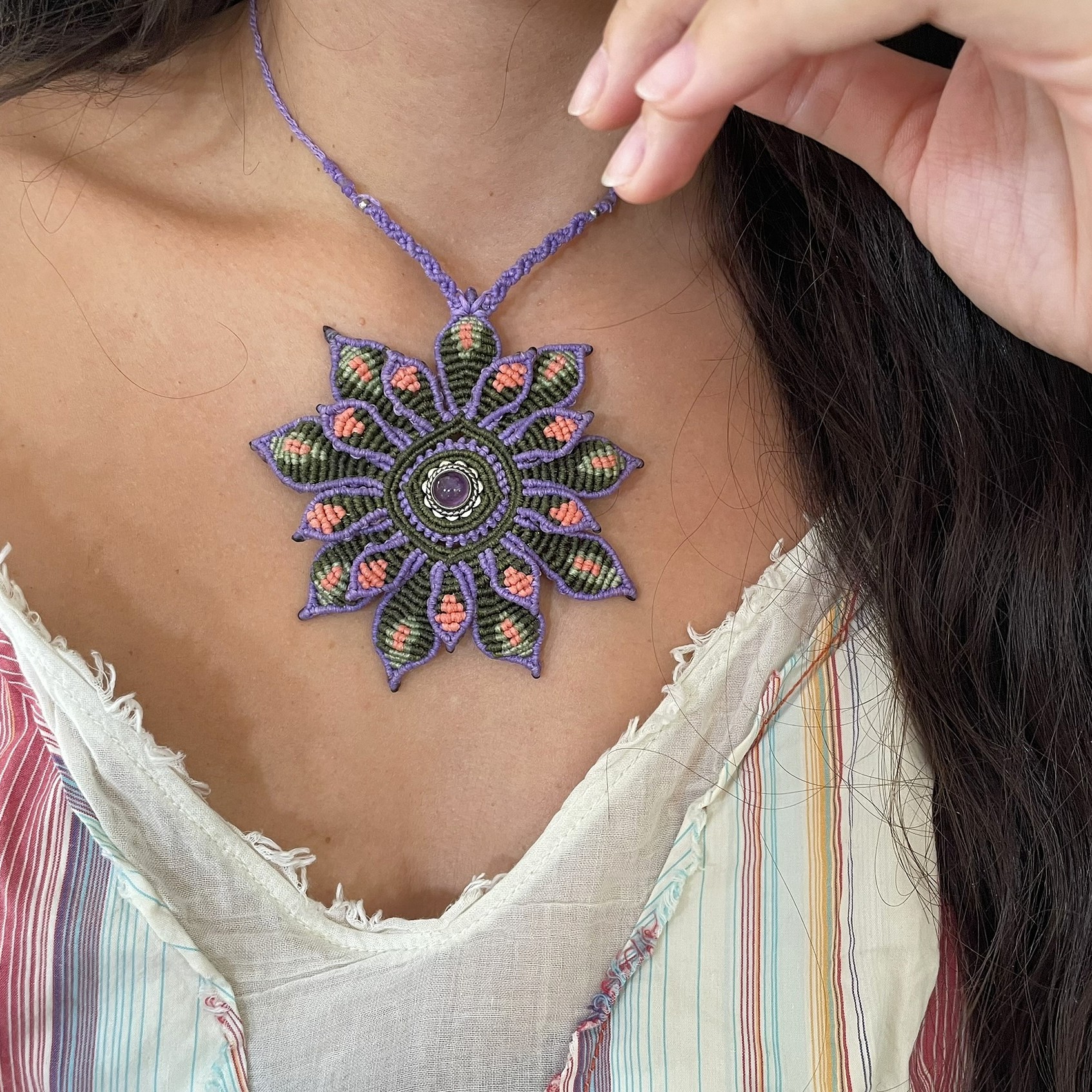 Αυτό το μακρραμέ κολιέ είναι κατασκευασμένο με κηροκλωστή άριστης ποιότητας και τις ημιπολύτιμες πέτρα Αμέθυστο. Με αυξομείωση για να προσαρμόζεται στο επιθυμητό ύψος.