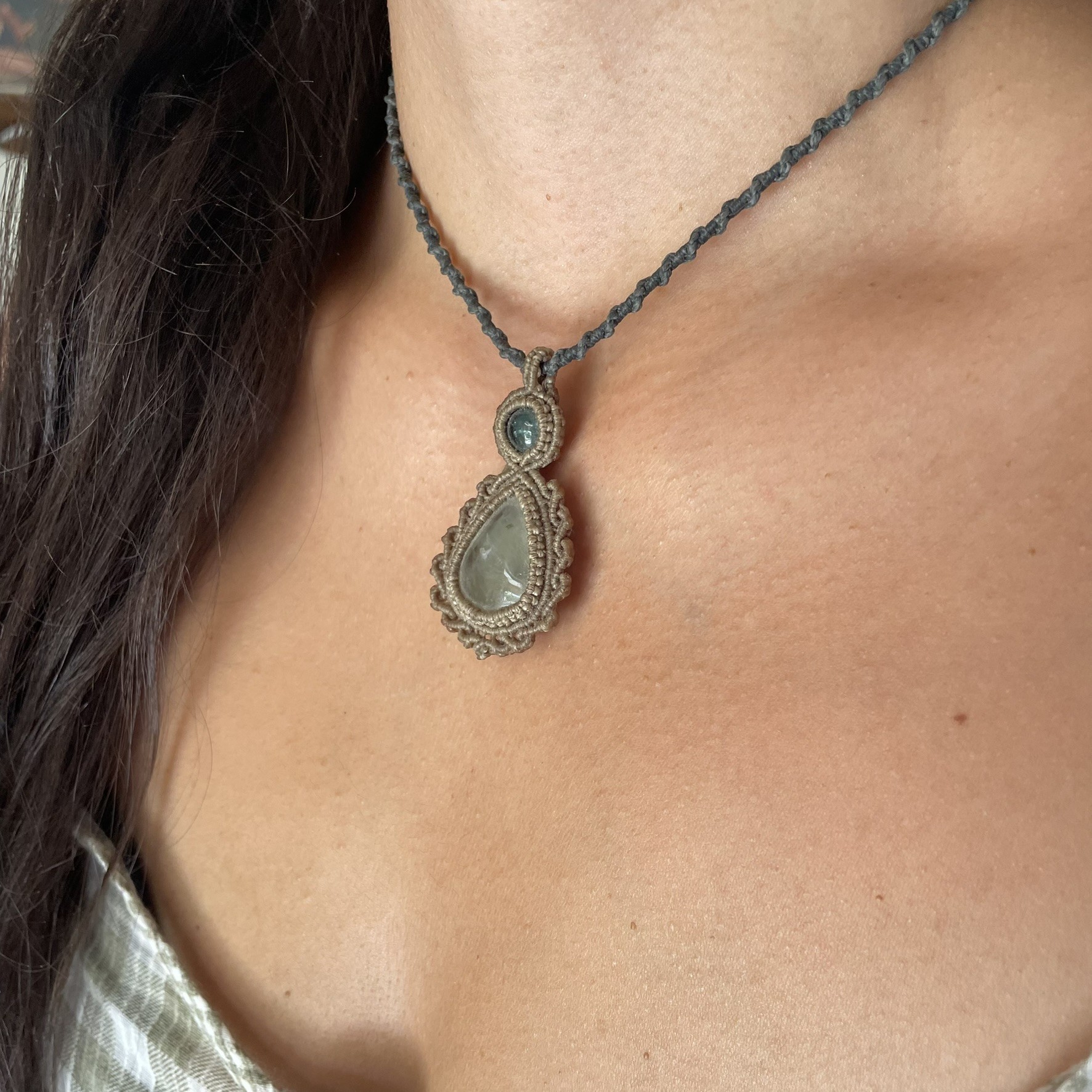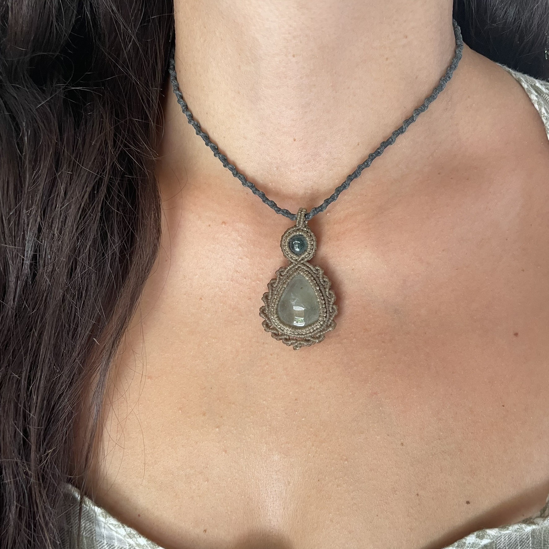 Αυτό το μακρραμέ κολιέ είναι κατασκευασμένο με κηροκλωστή άριστης ποιότητας και τις ημιπολύτιμες πέτρες Πρενιτη και Τουρμαλίνη. Με αυξομείωση για να προσαρμόζεται στο επιθυμητό ύψος.
