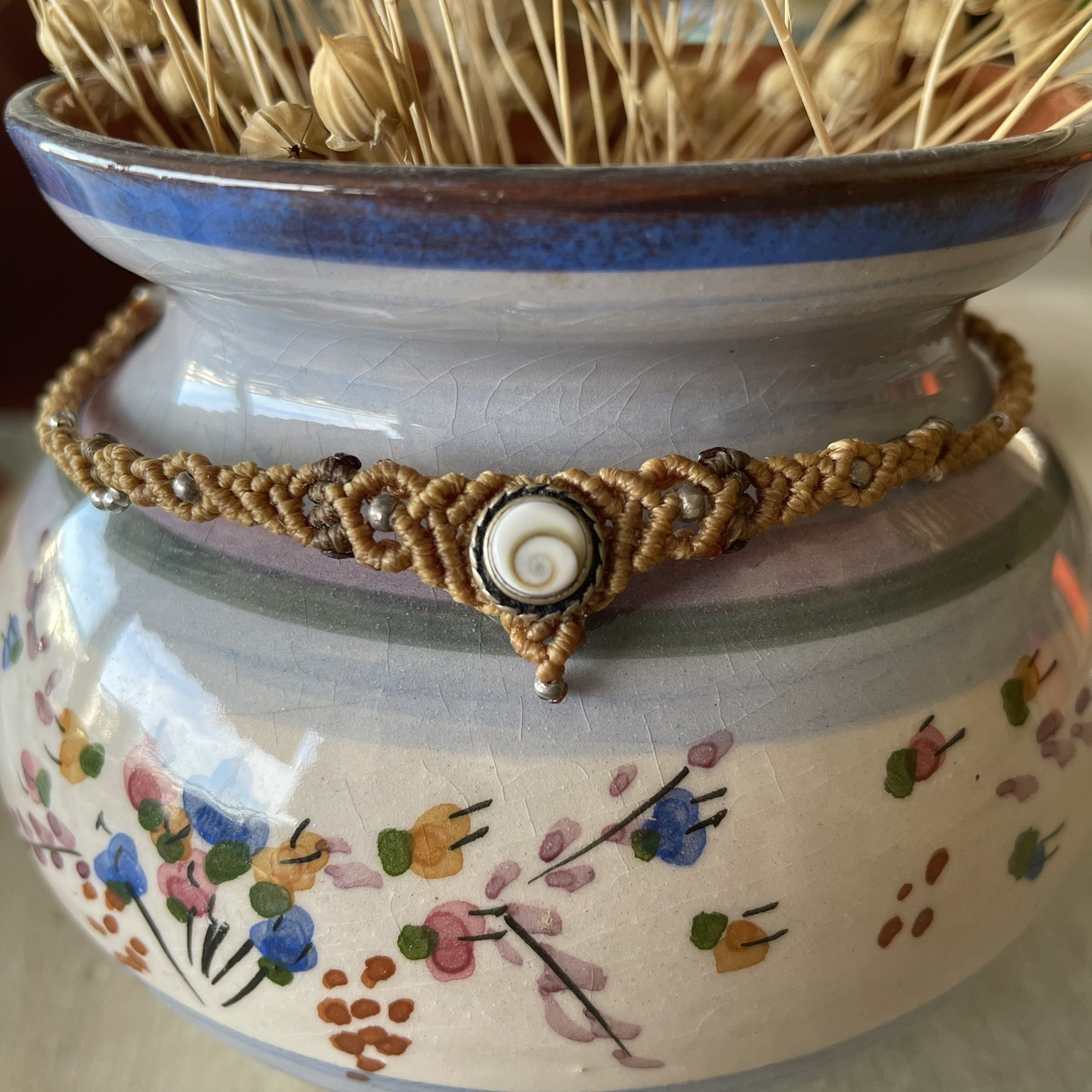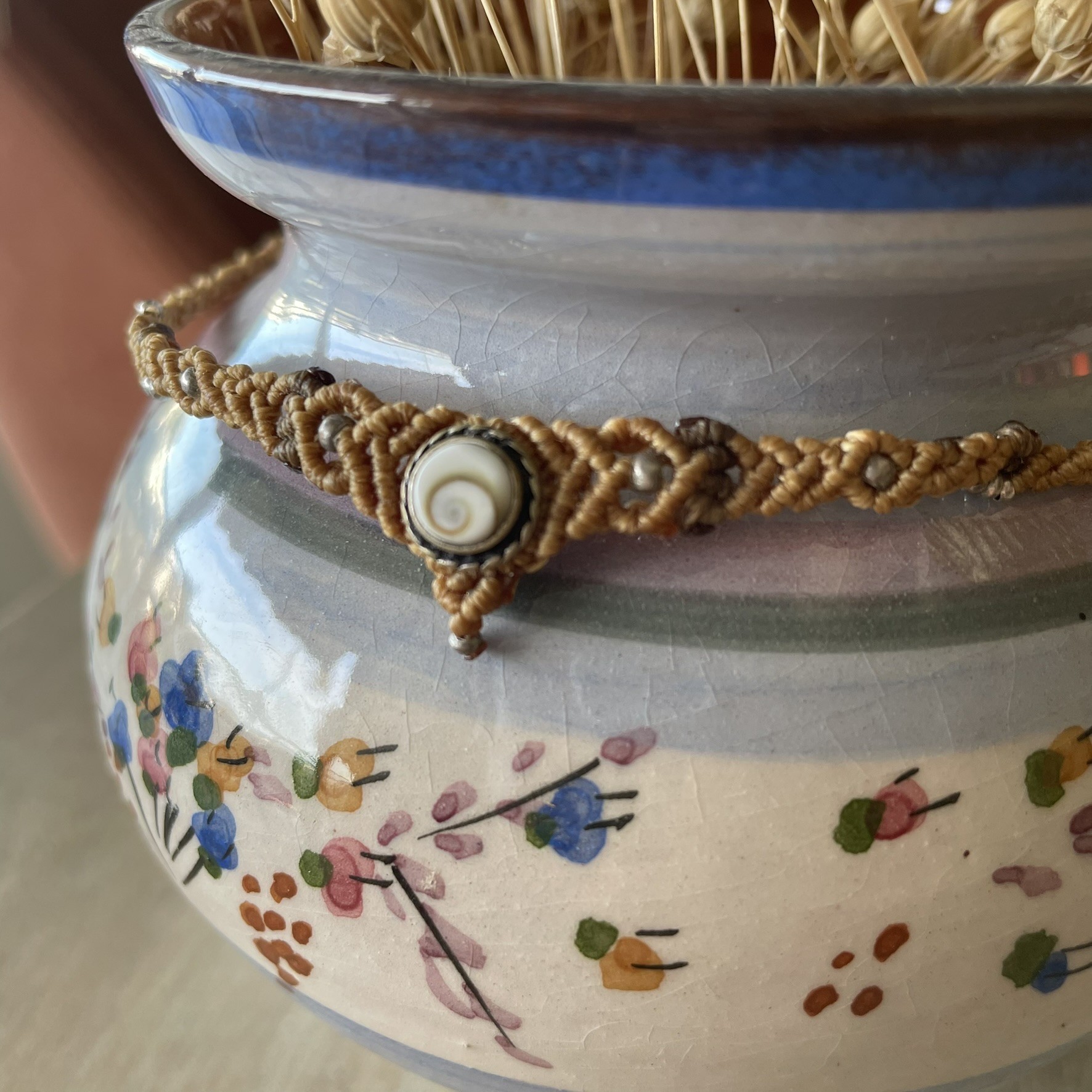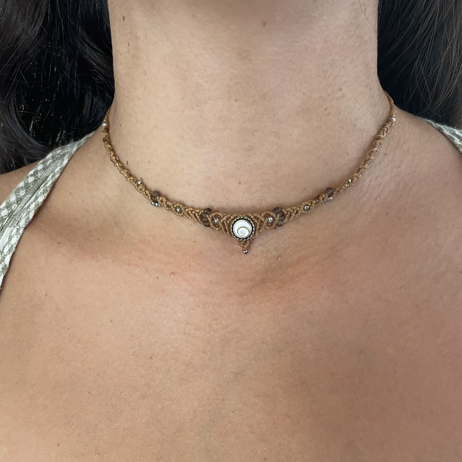Αυτό το μακρραμέ κολιέ είναι κατασκευασμένο με κηροκλωστή άριστης ποιότητας και Μάτι της θάλασσας, ένα κομμάτι κοχυλιού. Με αυξομείωση για να προσαρμόζεται στο επιθυμητό ύψος.