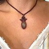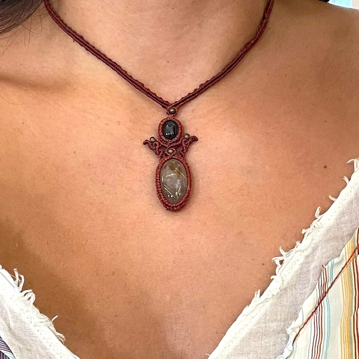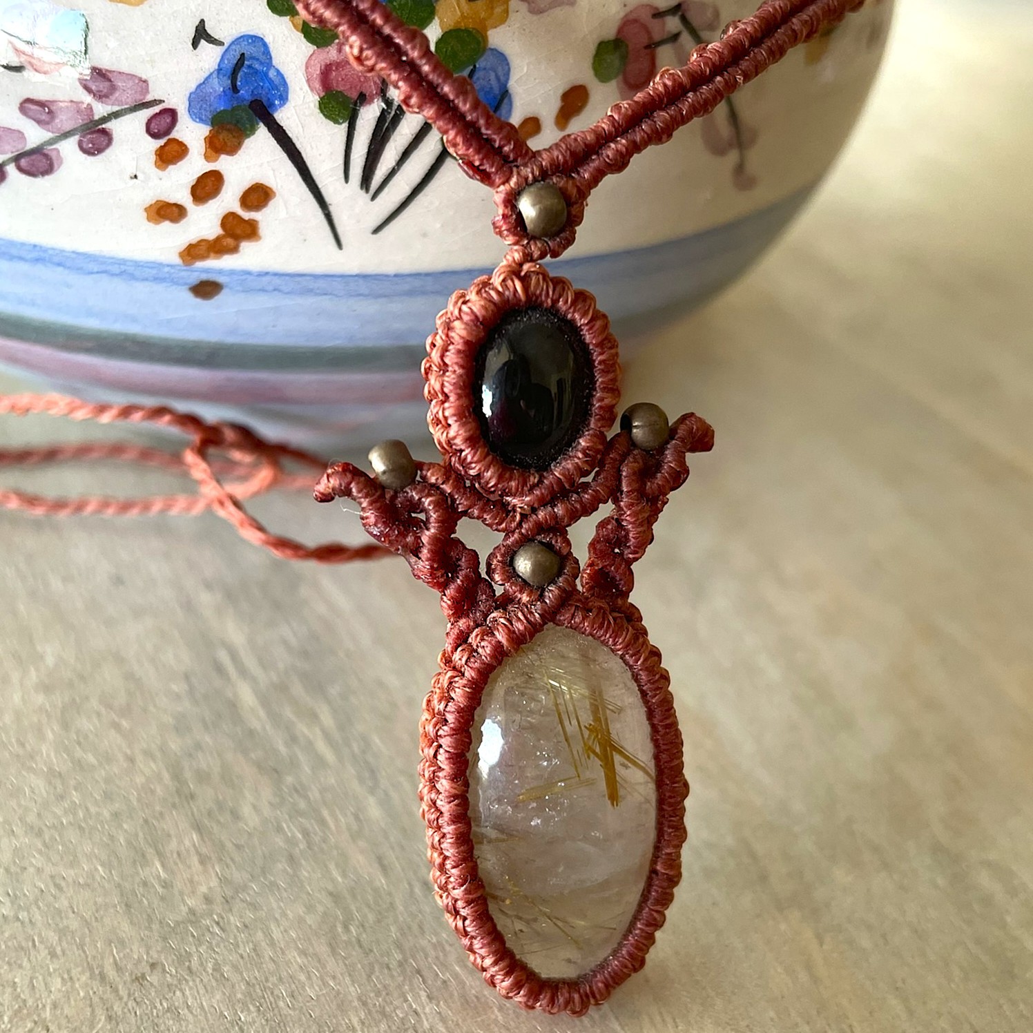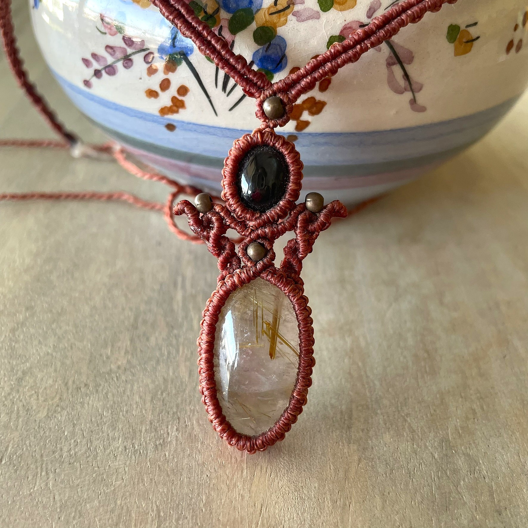 Αυτό το μακρραμέ κολιέ είναι κατασκευασμένο με κηροκλωστή άριστης ποιότητας και τις ημιπολύτιμες πέτρες Χρυσό Ρουτίλιο σε Χαλαζία και Ρούμπι σταρ. Με αυξομείωση για να προσαρμόζεται στο επιθυμητό ύψος.