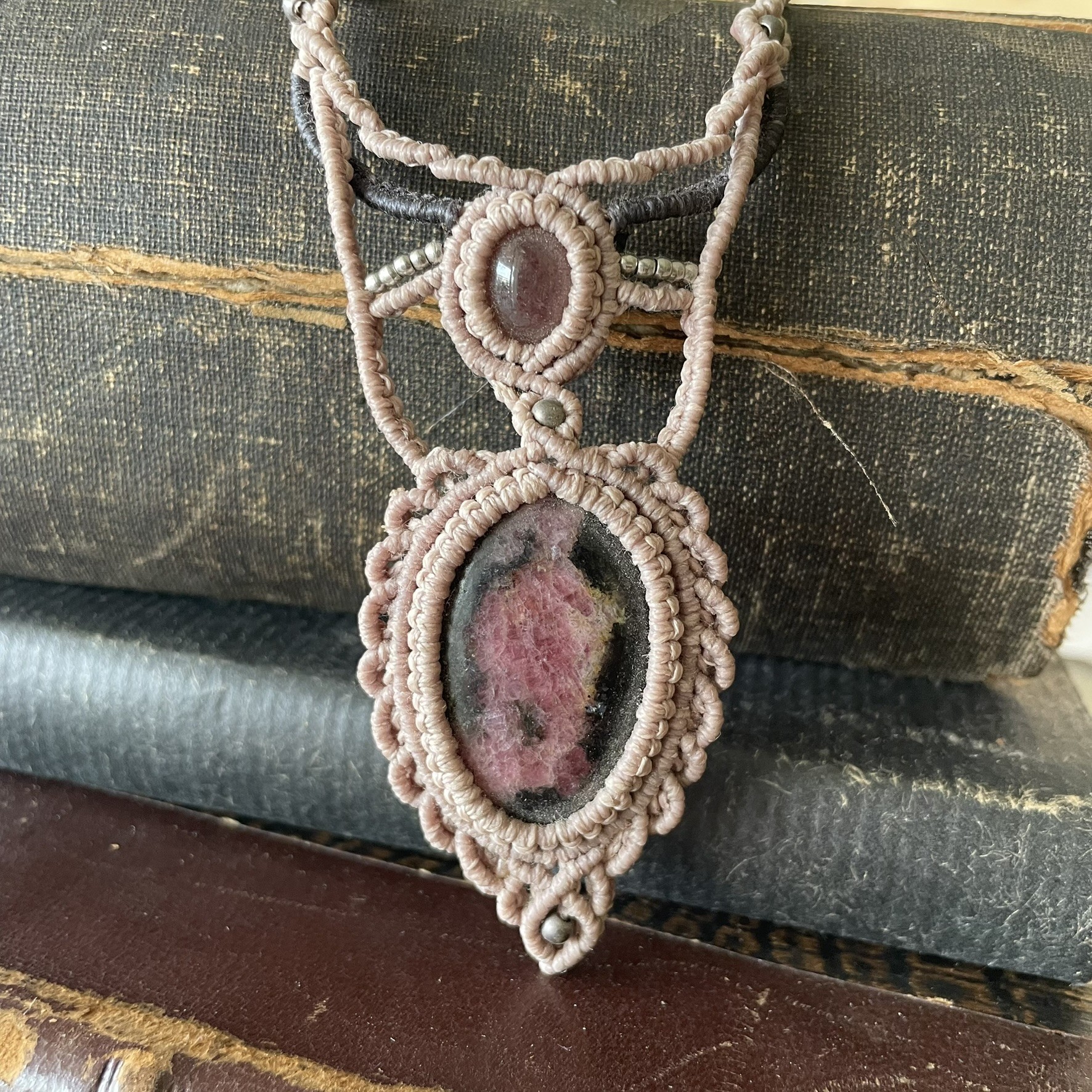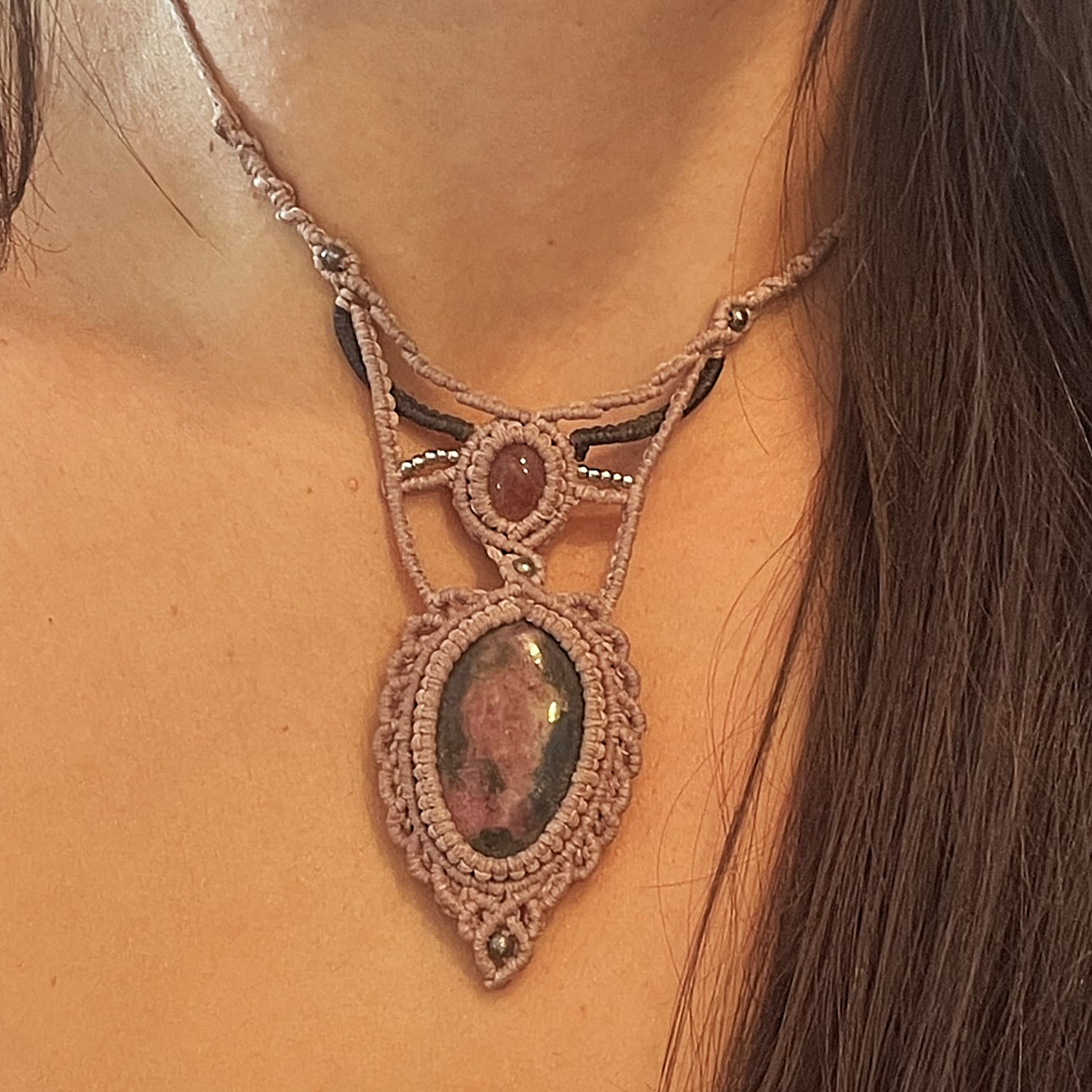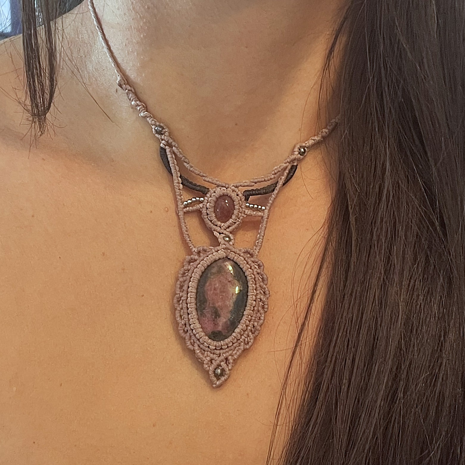 Αυτό το μακρραμέ κολιέ είναι κατασκευασμένο με κηροκλωστή άριστης ποιότητας και τις ημιπολύτιμες πέτρες Ροδονίτη και Φραουλίτη. Με αυξομείωση για να προσαρμόζεται στο επιθυμητό ύψος.