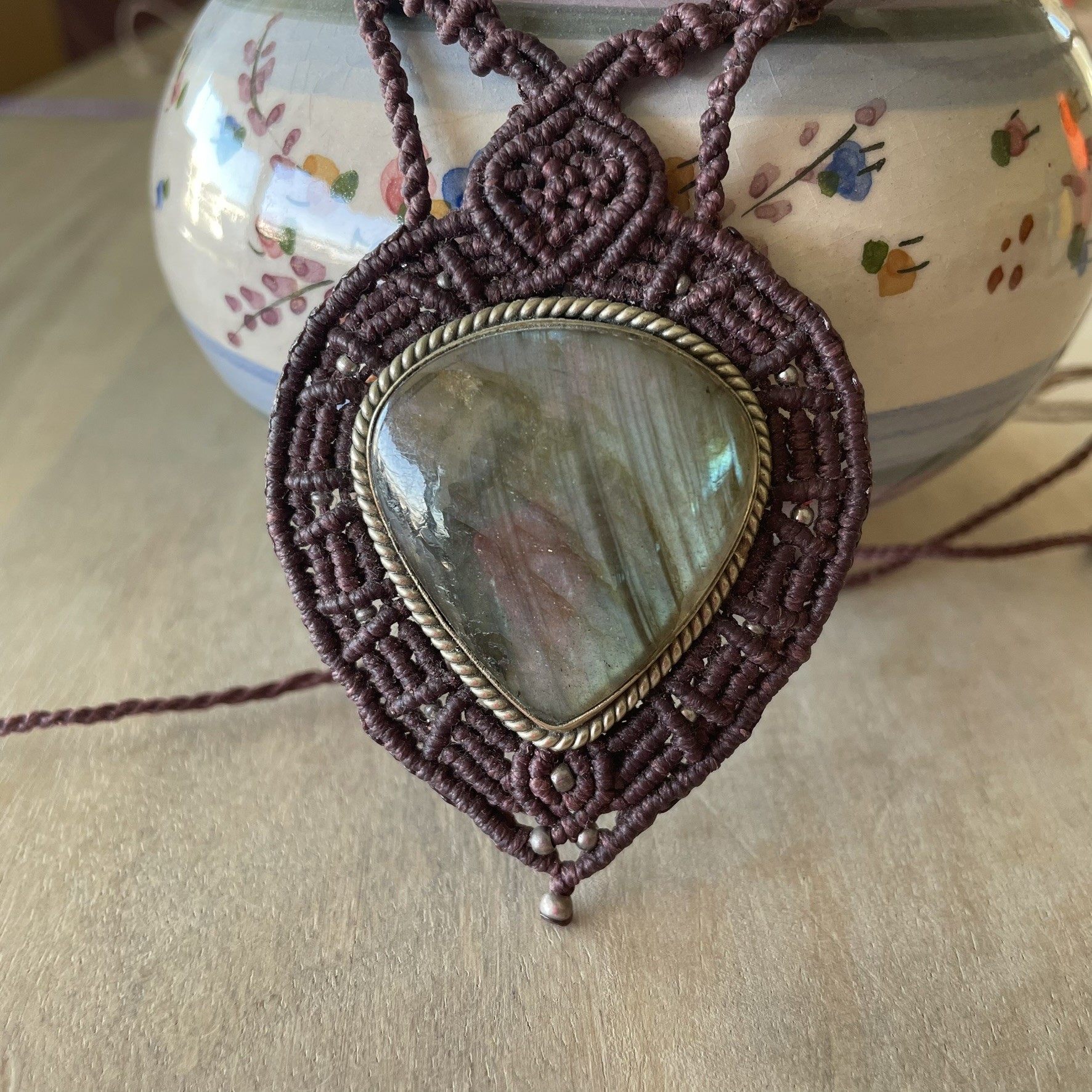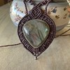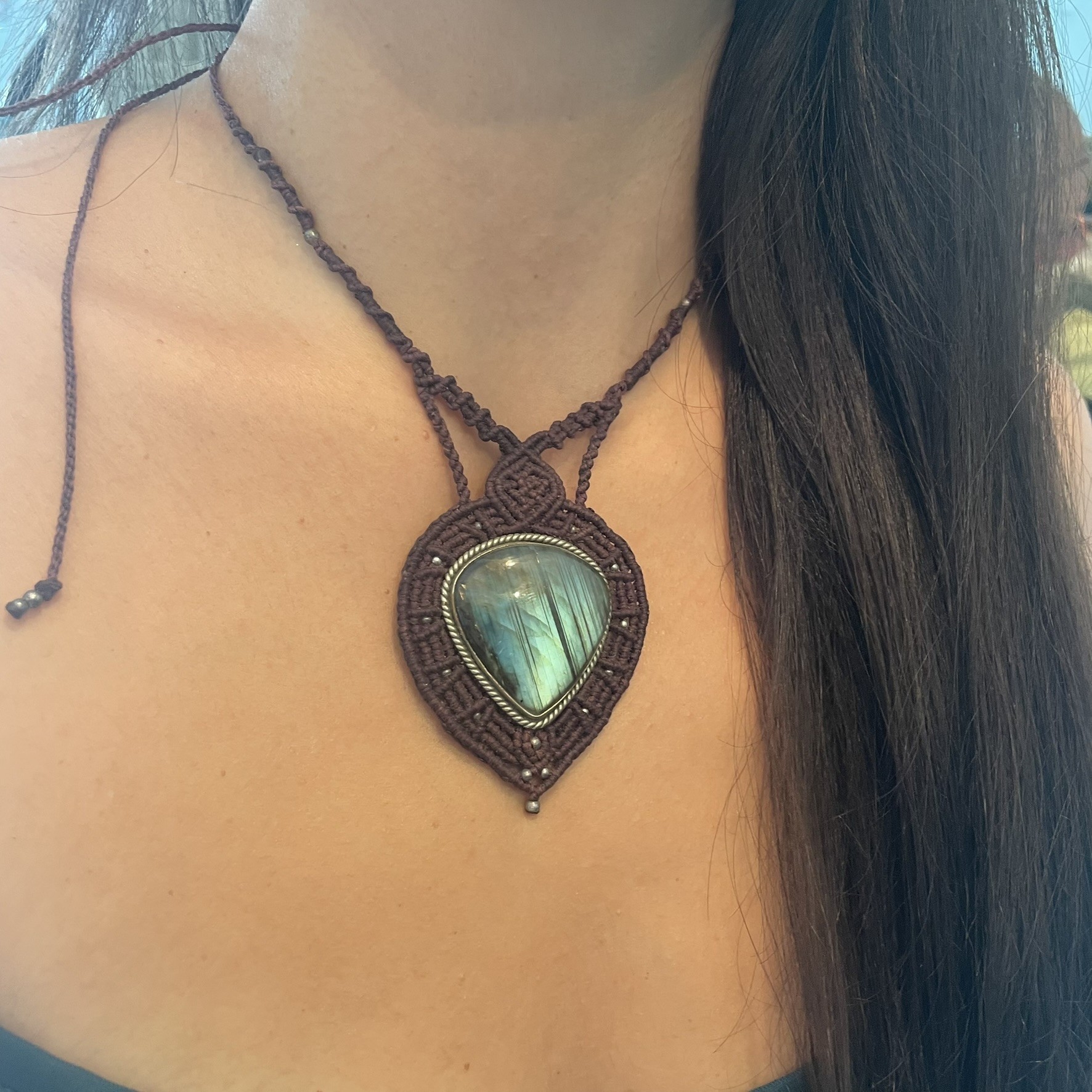 Αυτό το μακρραμέ κολιέ είναι κατασκευασμένο με κηροκλωστή άριστης ποιότητας και τις ημιπολύτιμη πέτρα Λαμπραντορίτη. Με αυξομείωση για να προσαρμόζεται στο επιθυμητό ύψος.