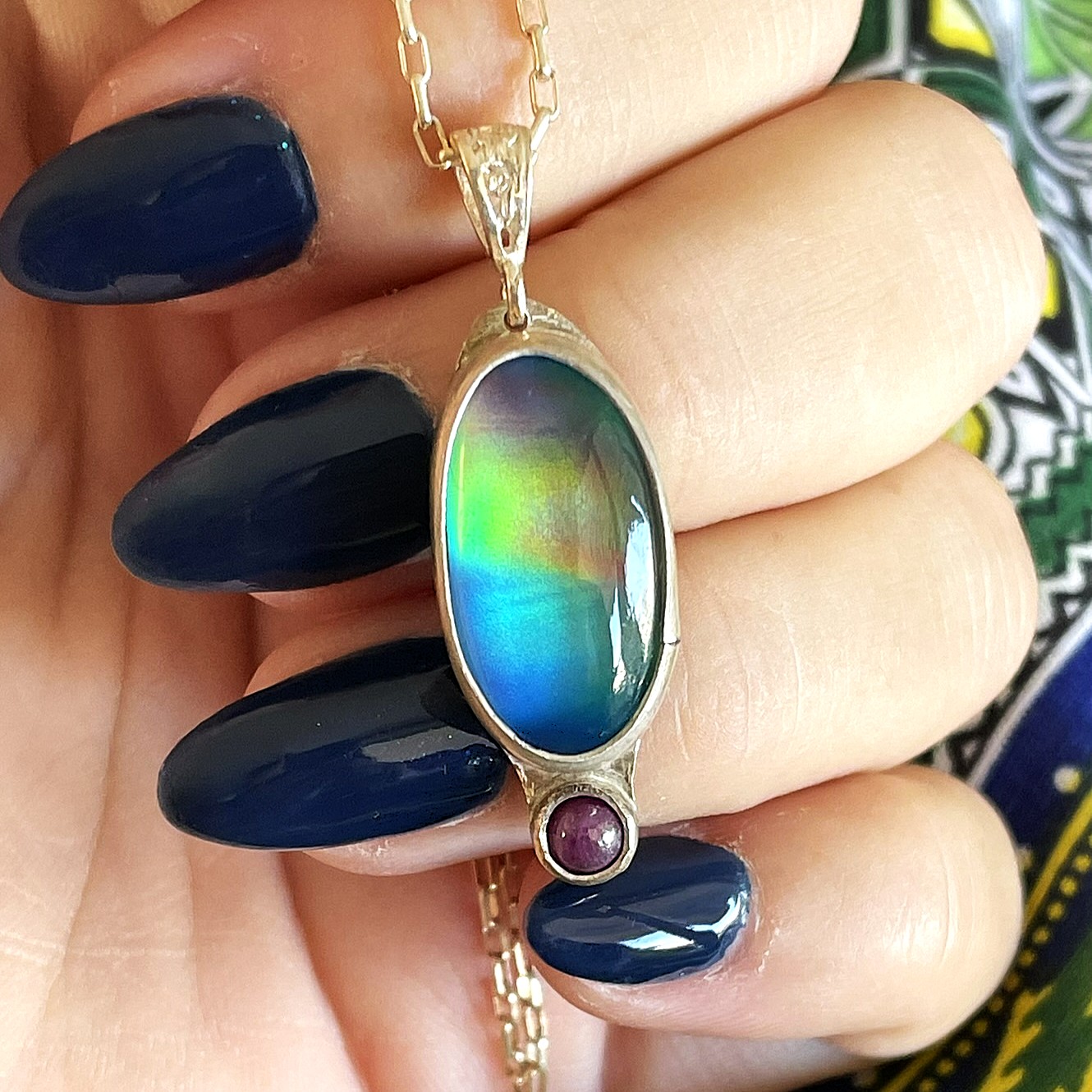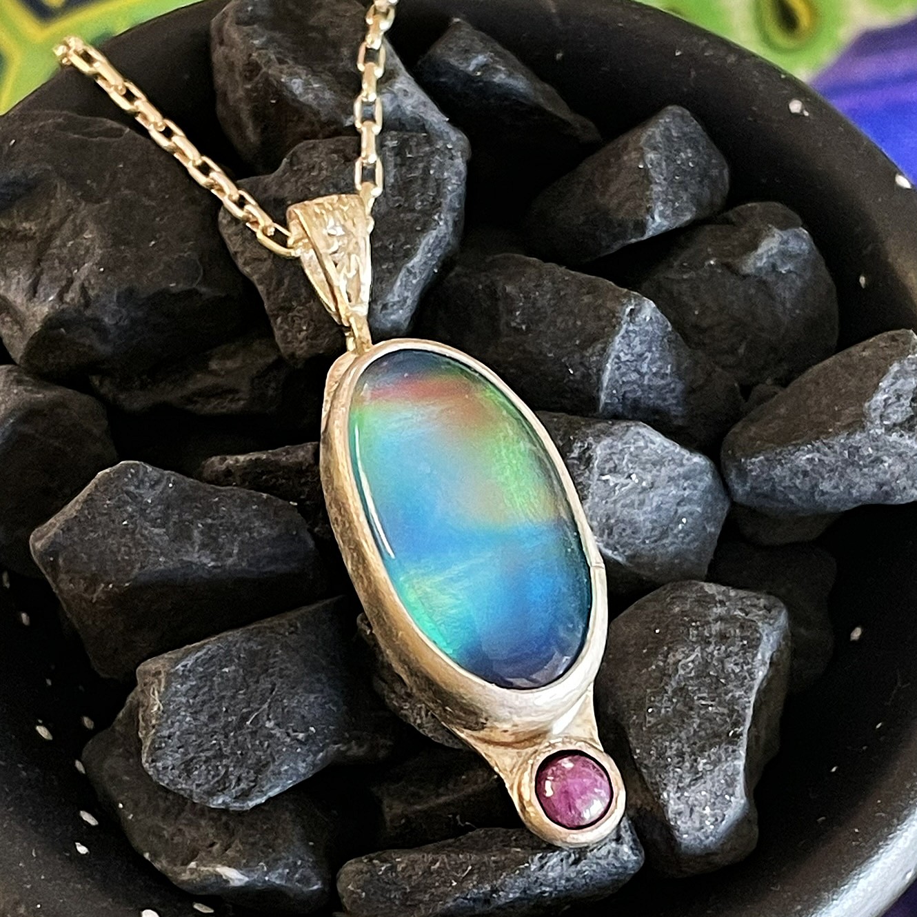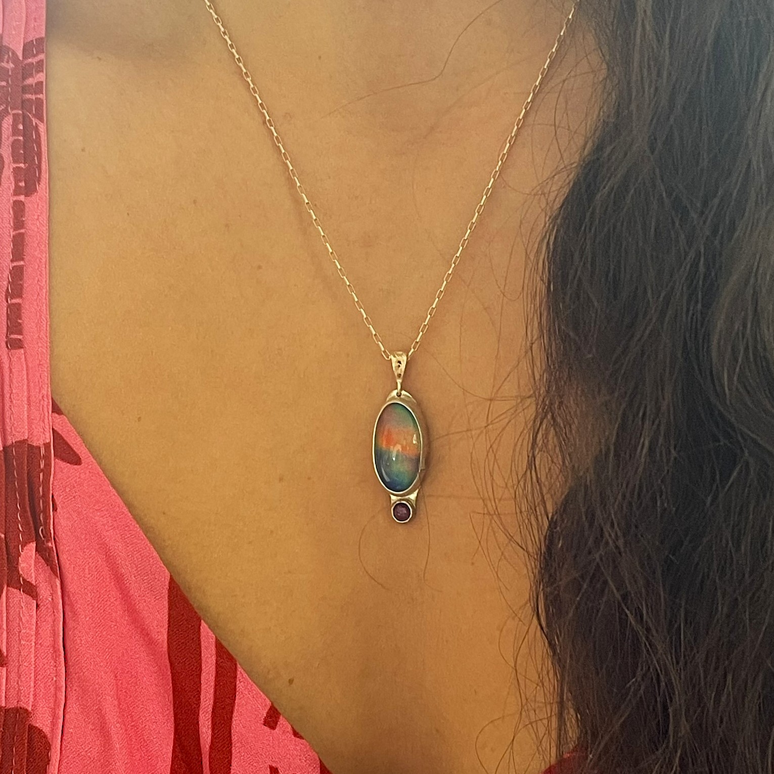 Αυτό το κολίε είναι κατασκευασμένο με ασήμι 925 και με τις ημιπολύτιμες πέτρες Aurora Οπάλιο και Ρουμπίνι. Όλα τα κοσμήματά μας κατασκευάζονται στο εργαστήριο μας με πολύ μεράκι, και εκτός από τα μικρά και απλά μας σχέδια όλα είναι μοναδικά και δεν κατασκευάζονται σχεδόν ποτέ με τον ίδιο τρόπο! Όλα τα ασημένια κοσμήματα μας συνοδεύονται με prenium συσκευασία suede τσαντάκι-φακελάκι σφραγισμένο με την επωνυμία μας!