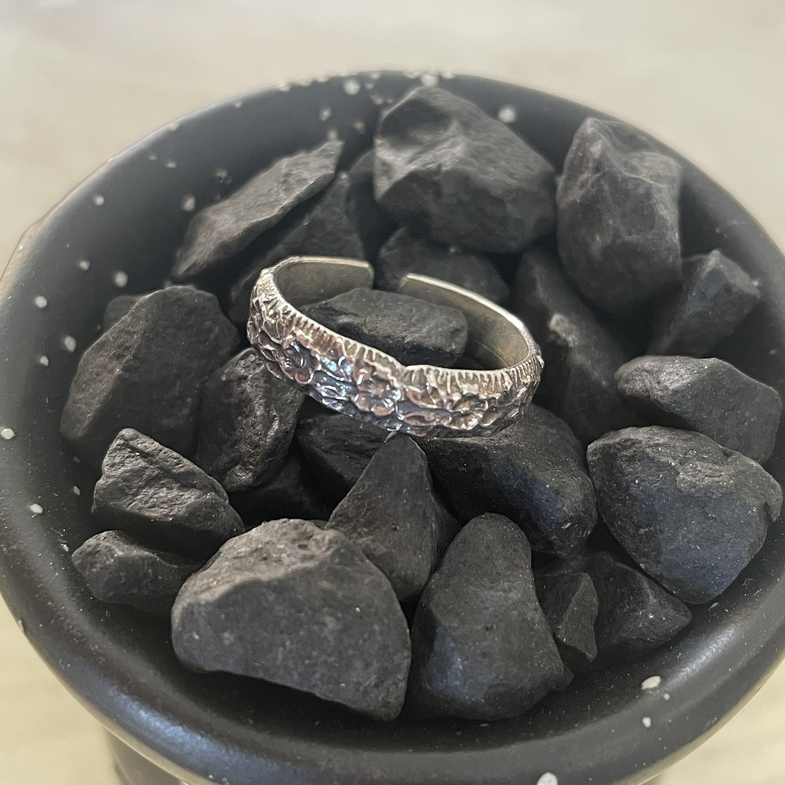Δαχτυλίδι κατασκευασμένο με ασήμι 925. Νούμερο αυξομειούμενο από 50-60(us:από 6-9). Ασημένιο πλατύ σύρμα στο οποίο εφαρμόστηκαν στάμπες μετάλλου με σφυρί. Όλα τα κοσμήματά μας κατασκευάζονται στο εργαστήριο μας με πολύ μεράκι, και εκτός από τα μικρά και απλά μας σχέδια όλα είναι μοναδικά και δεν κατασκευάζονται σχεδόν ποτέ με τον ίδιο τρόπο!