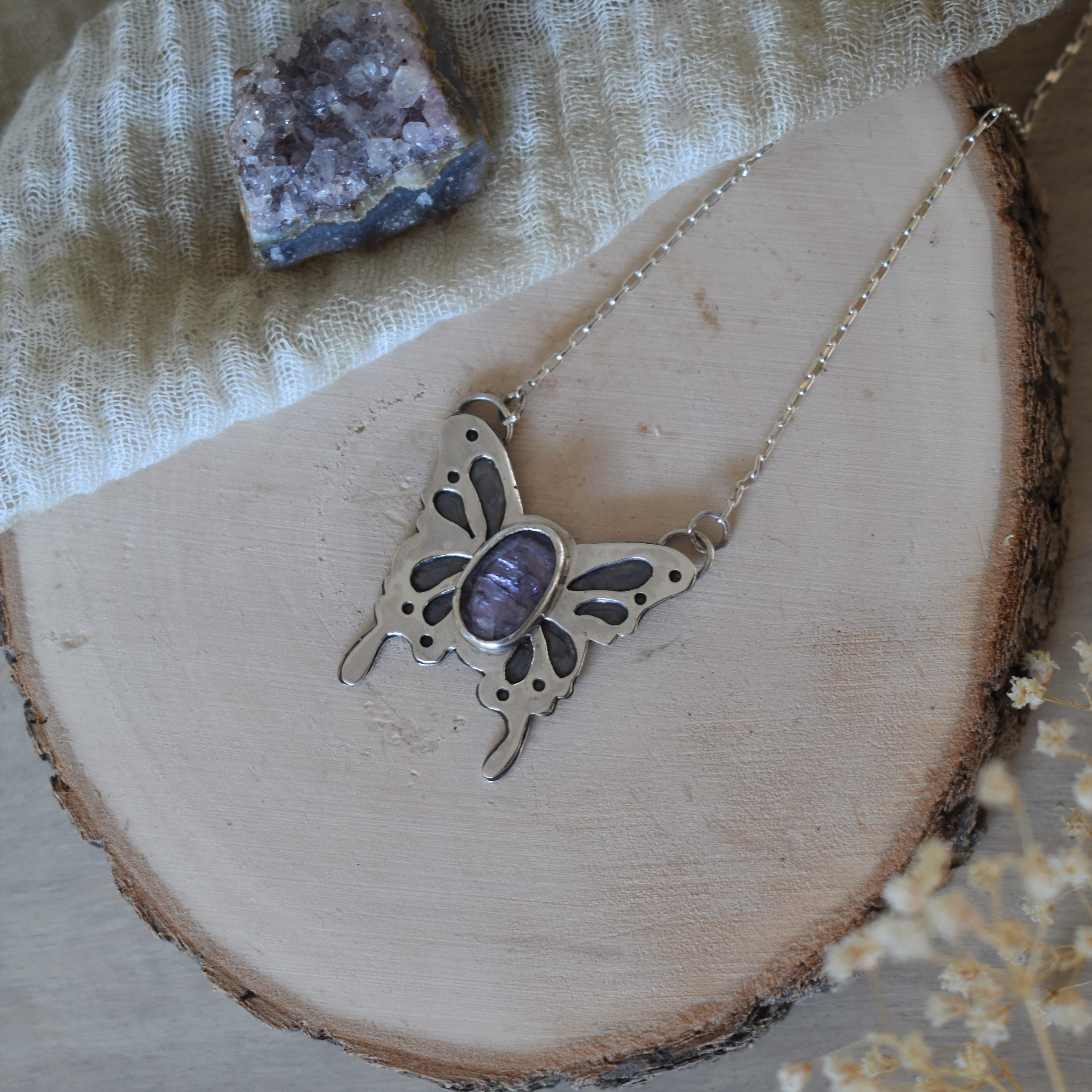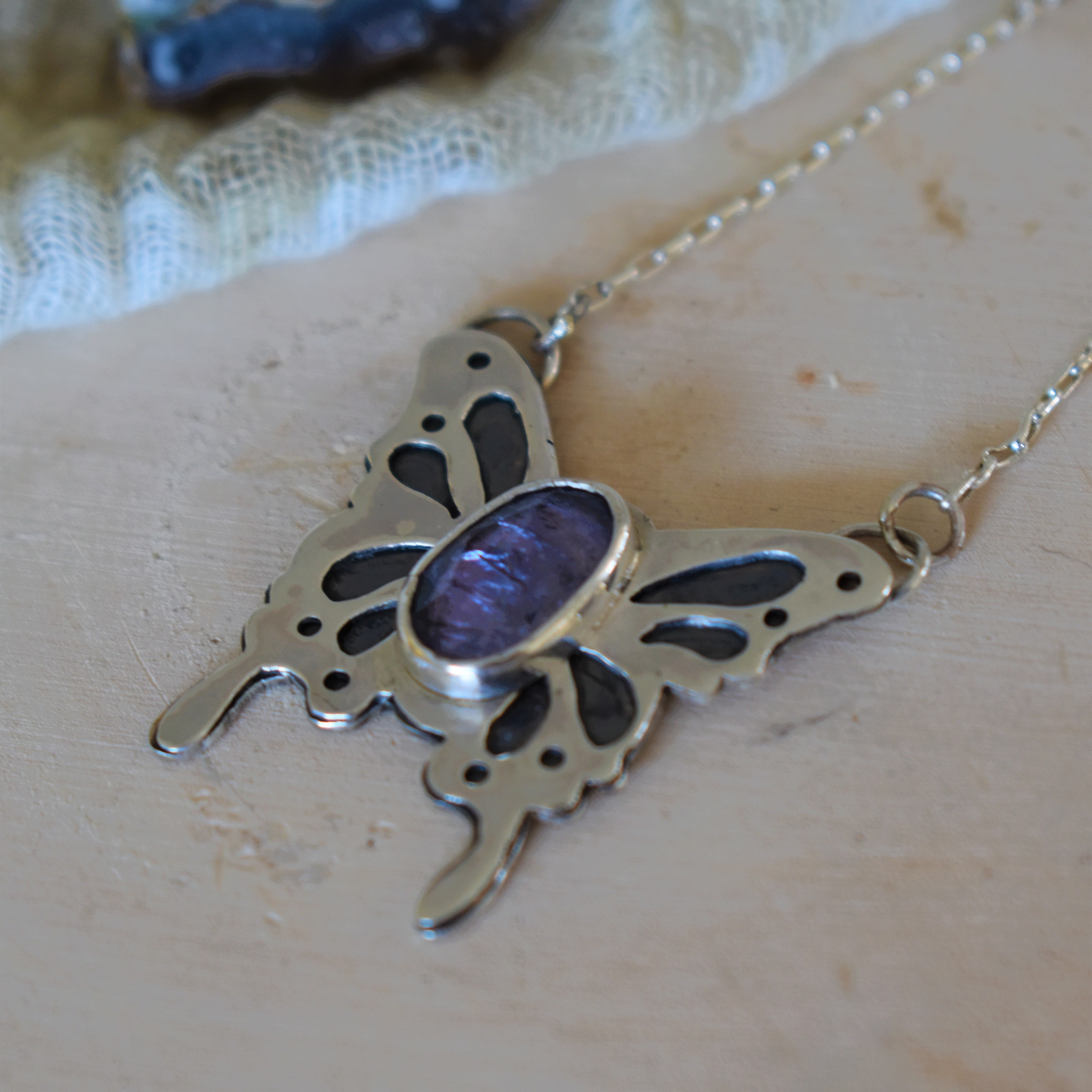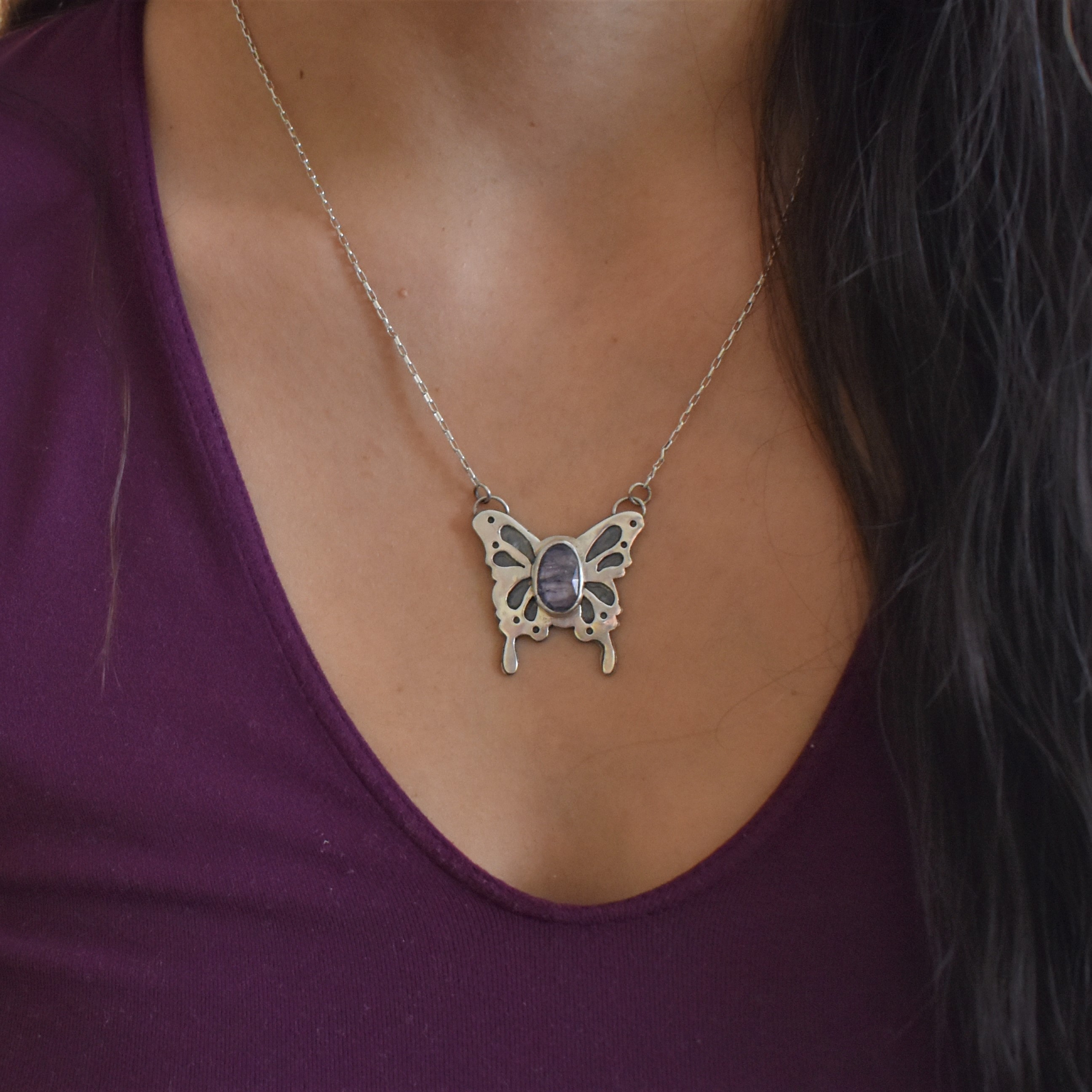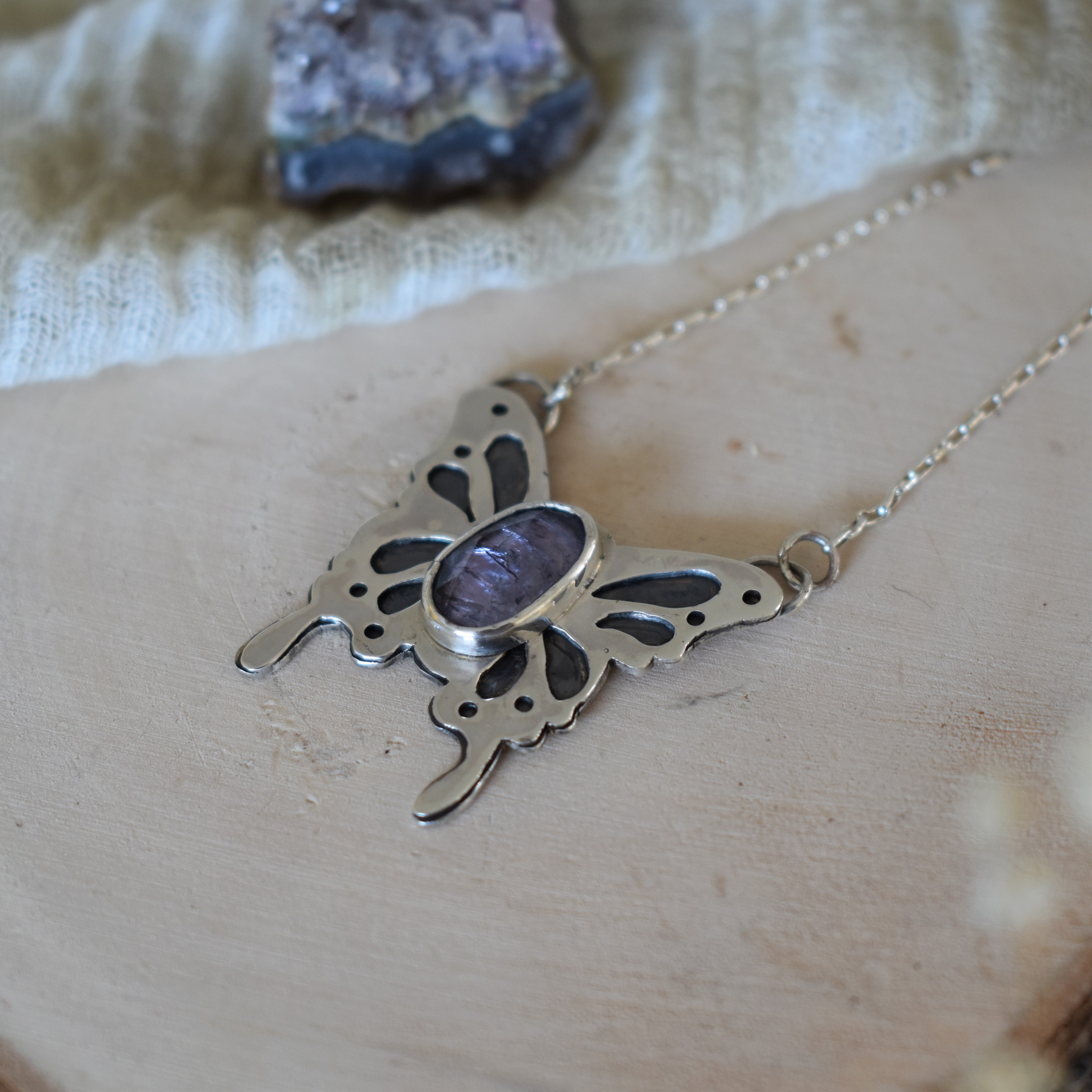 Aυτό το χειροποίητο κολιέ πεταλούδα είναι κατασκευασμένο με ασήμι 925 και με την φυσική ημιπολύτιμη πέτρα Ιολίτη. Όλα τα κοσμήματά μας κατασκευάζονται στο εργαστήριο μας με πολύ μεράκι, και εκτός από τα μικρά και απλά μας σχέδια όλα είναι μοναδικά και δεν κατασκευάζονται σχεδόν ποτέ με τον ίδιο τρόπο! Όλα τα ασημένια κοσμήματα μας συνοδεύονται με prenium συσκευασία suede τσαντάκι-φακελάκι σφραγισμένο με την επωνυμία μας!