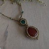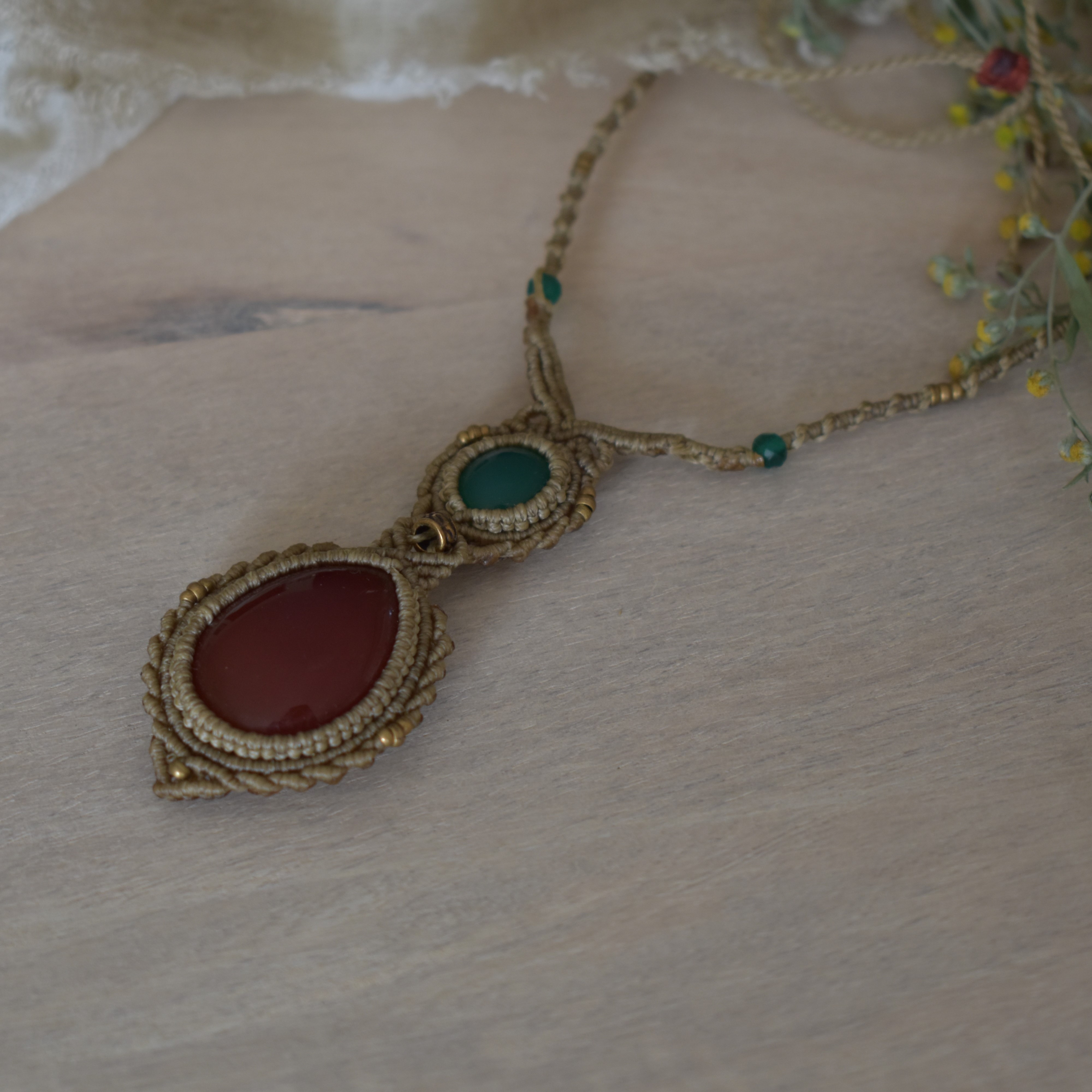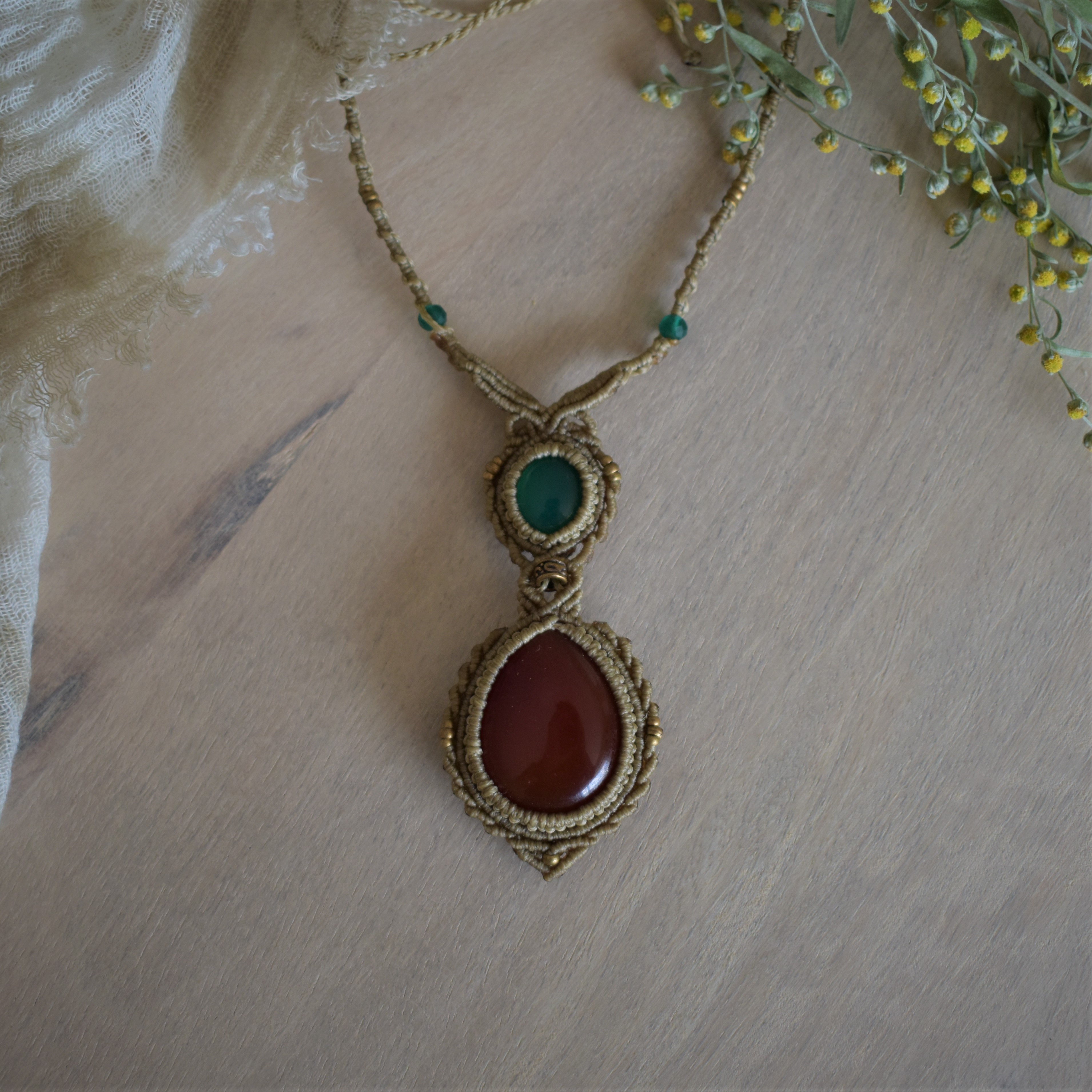 Αυτό το μακρραμέ κολιέ είναι κατασκευασμένο με κηροκλωστή άριστης ποιότητας και τις ημιπολύτιμες πέτρες Κορνεόλη και Πράσινο Αχάτη. Με αυξομείωση για να προσαρμόζεται στο επιθυμητό ύψος.